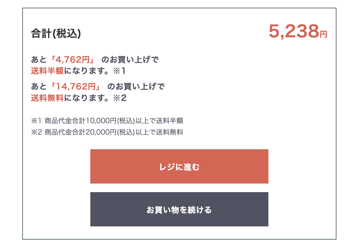 カート画面に「あと◾️◾️円で送料が半額になります(または無料になります)」というメッセージを動的に表示。現在のカゴの中身と割引ラインの差額を自動計算して訴求します。